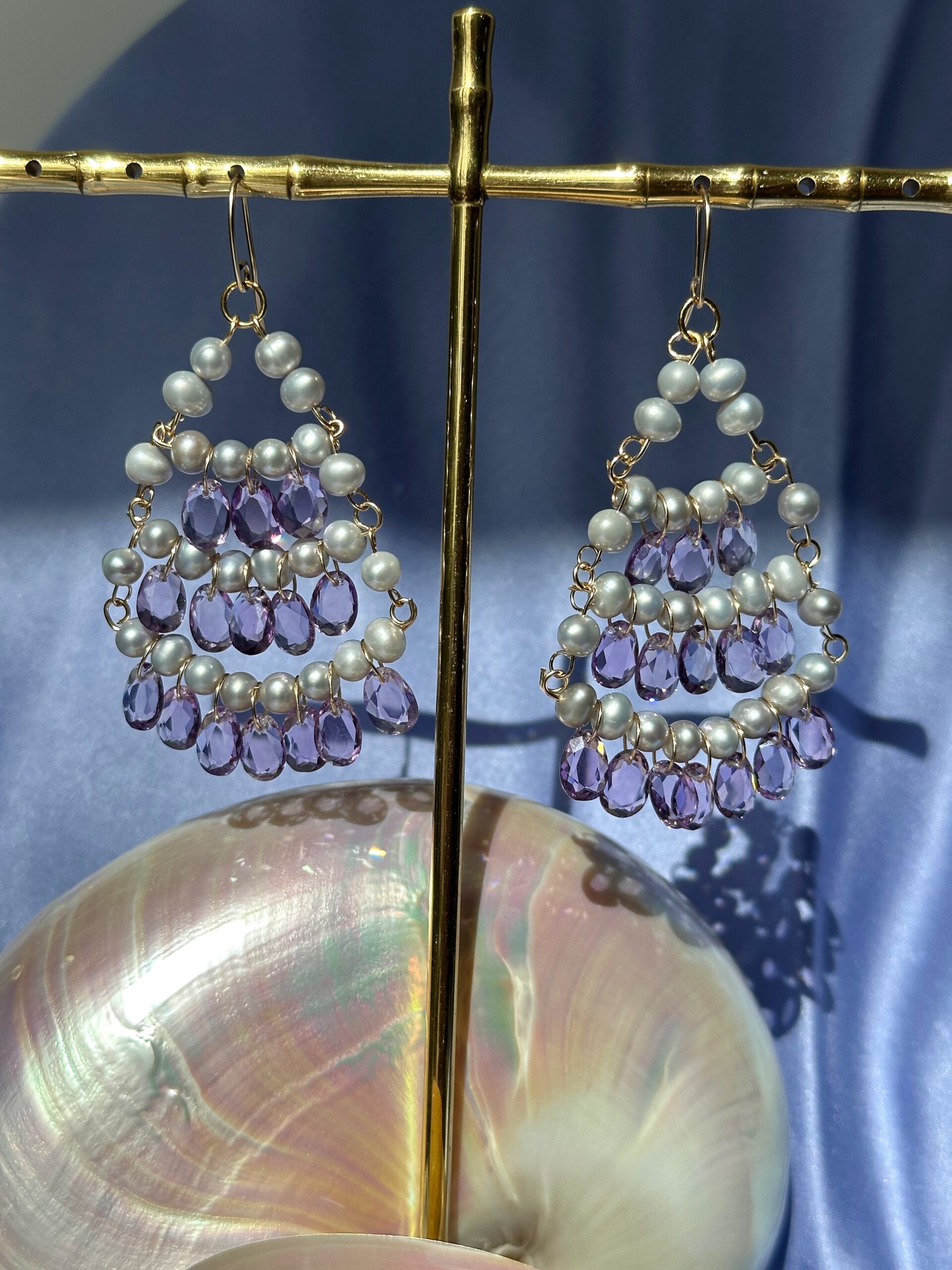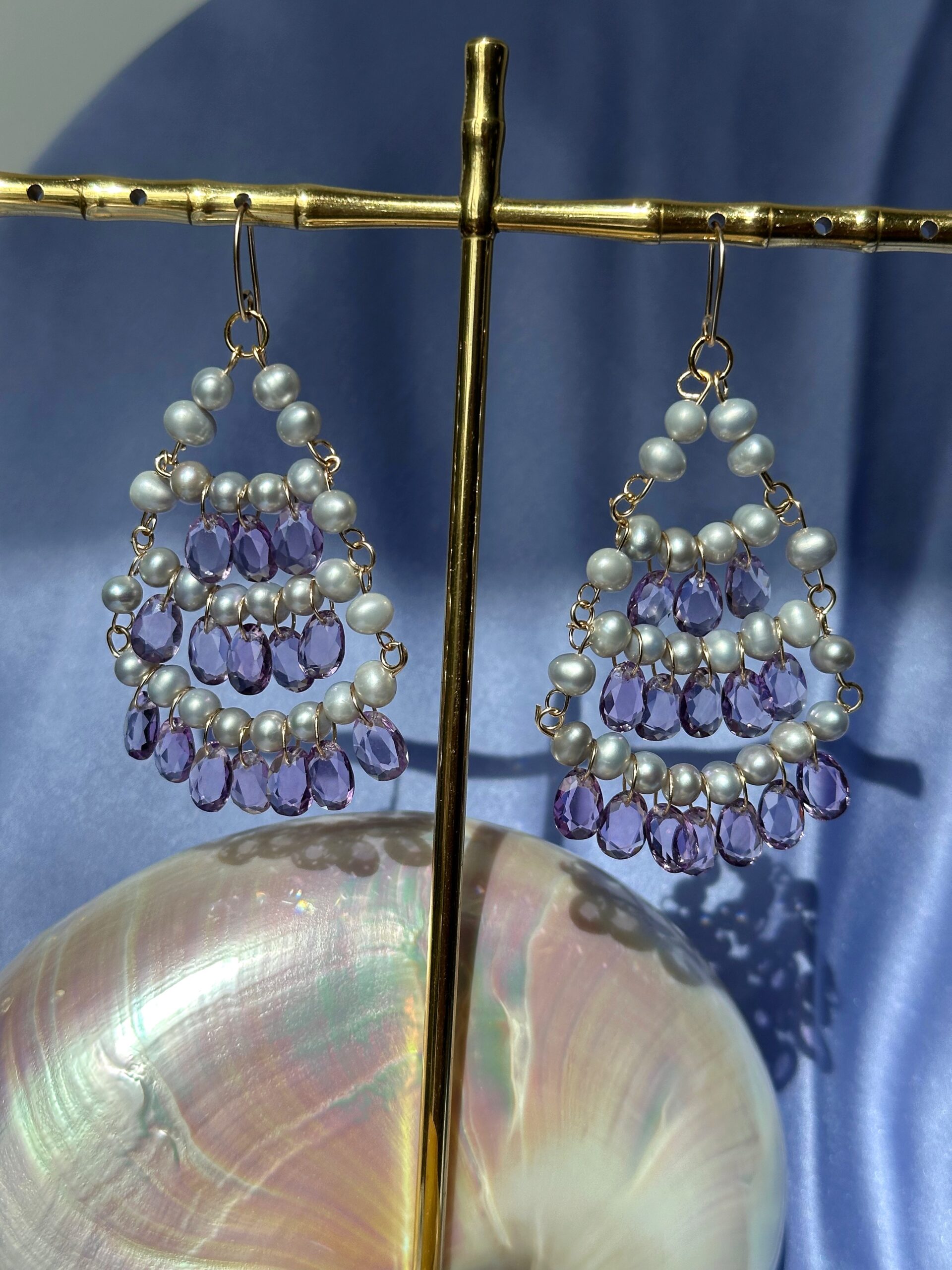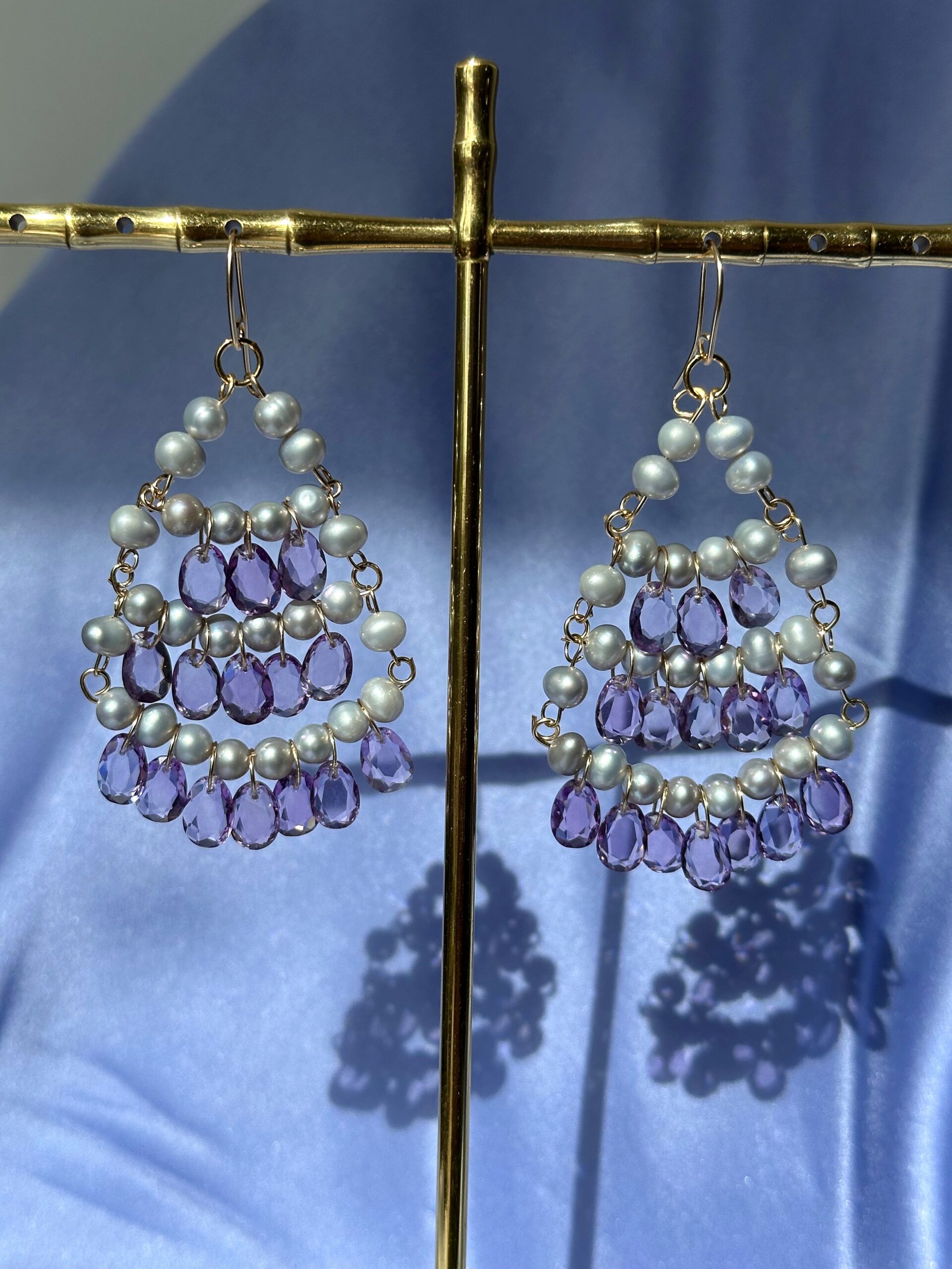 A beautiful and opulent new piece, this is my ‘Dentelle’ chandelier earrings pair featuring gray pearls and pink amethysts. I have named this design ‘dentelle’ because it reminds me a bit of delicate yet intricate lace.