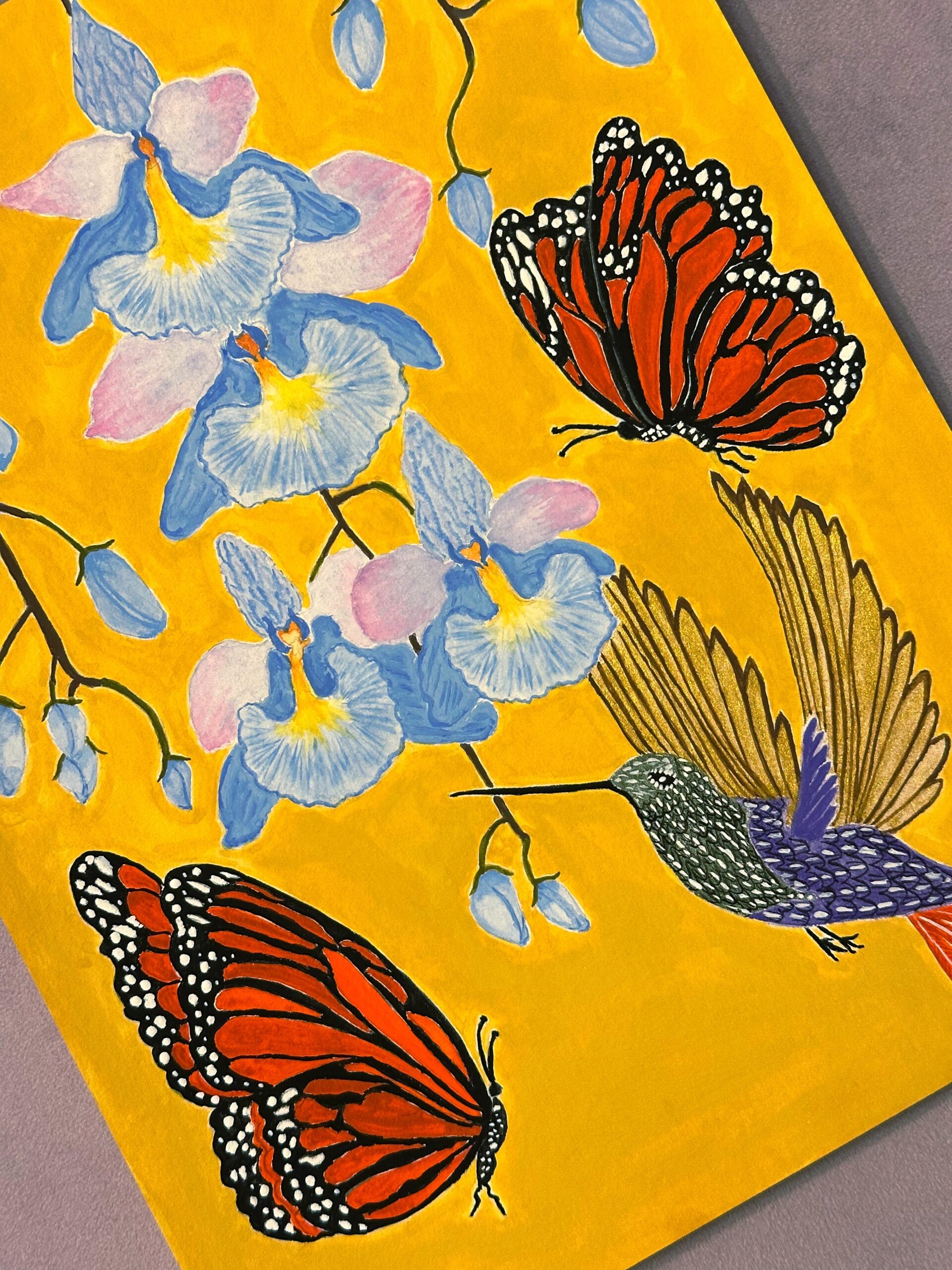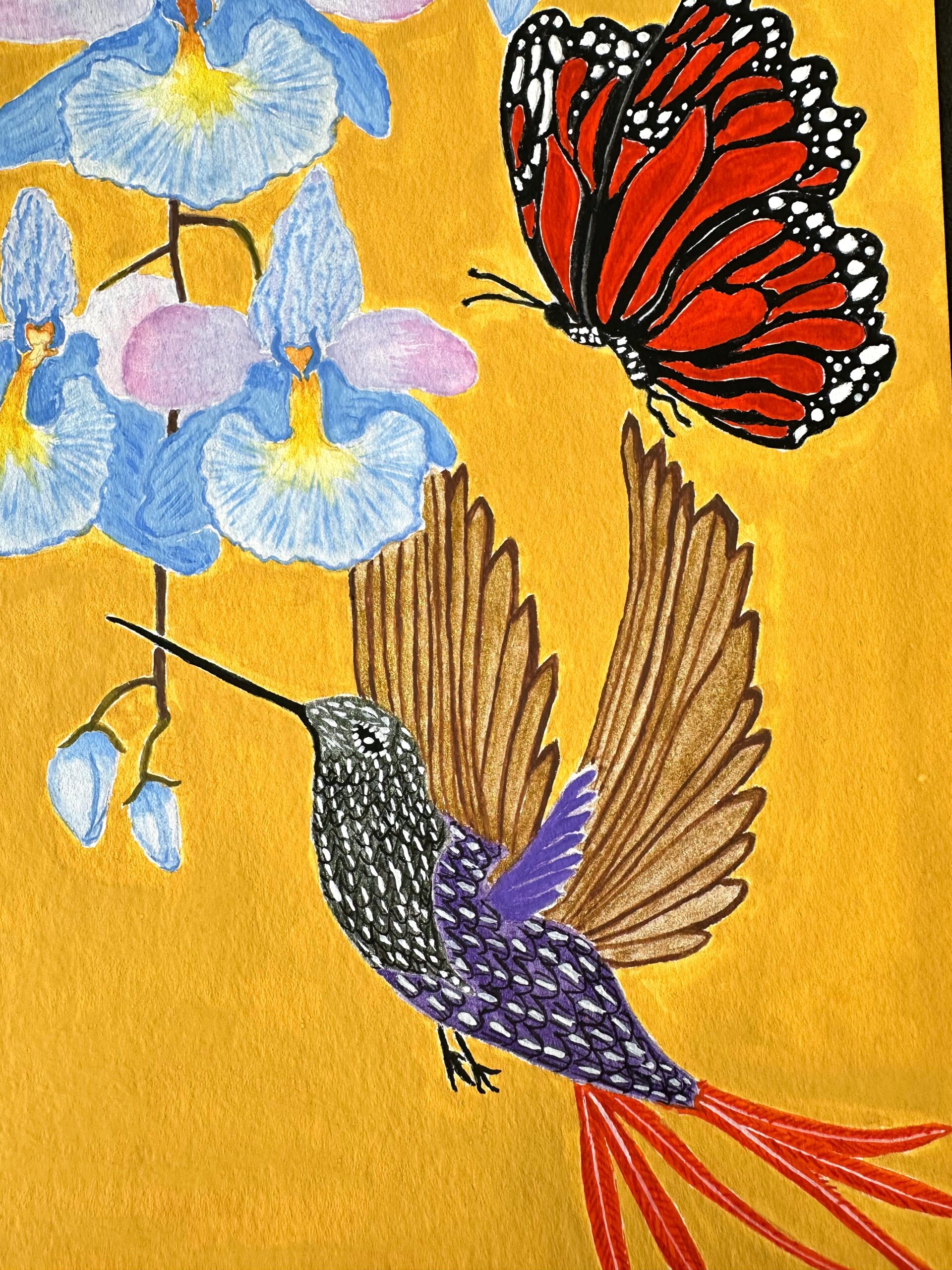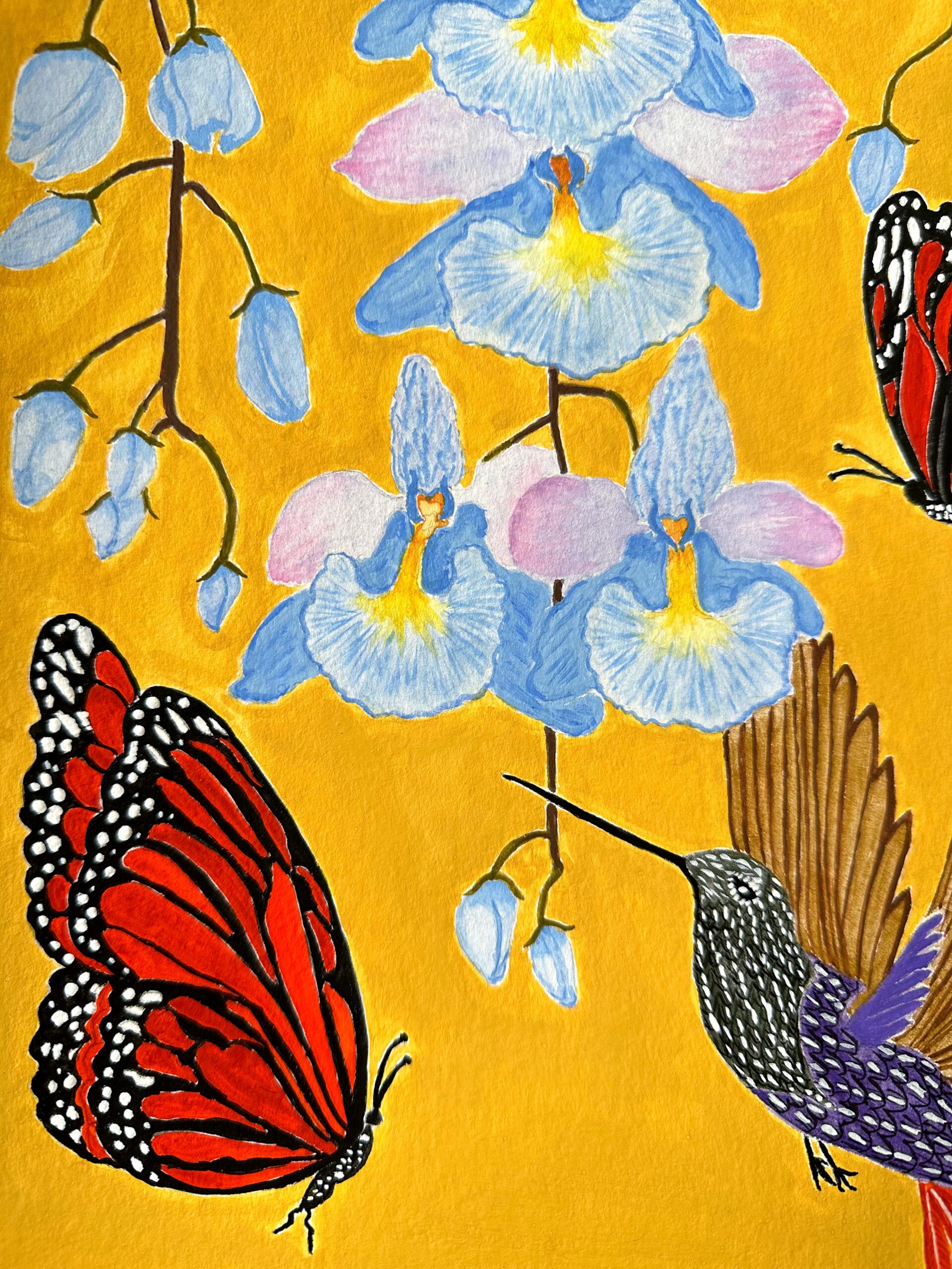 Humingbird, Monarch Butterflies and Pastel Blue Orchids