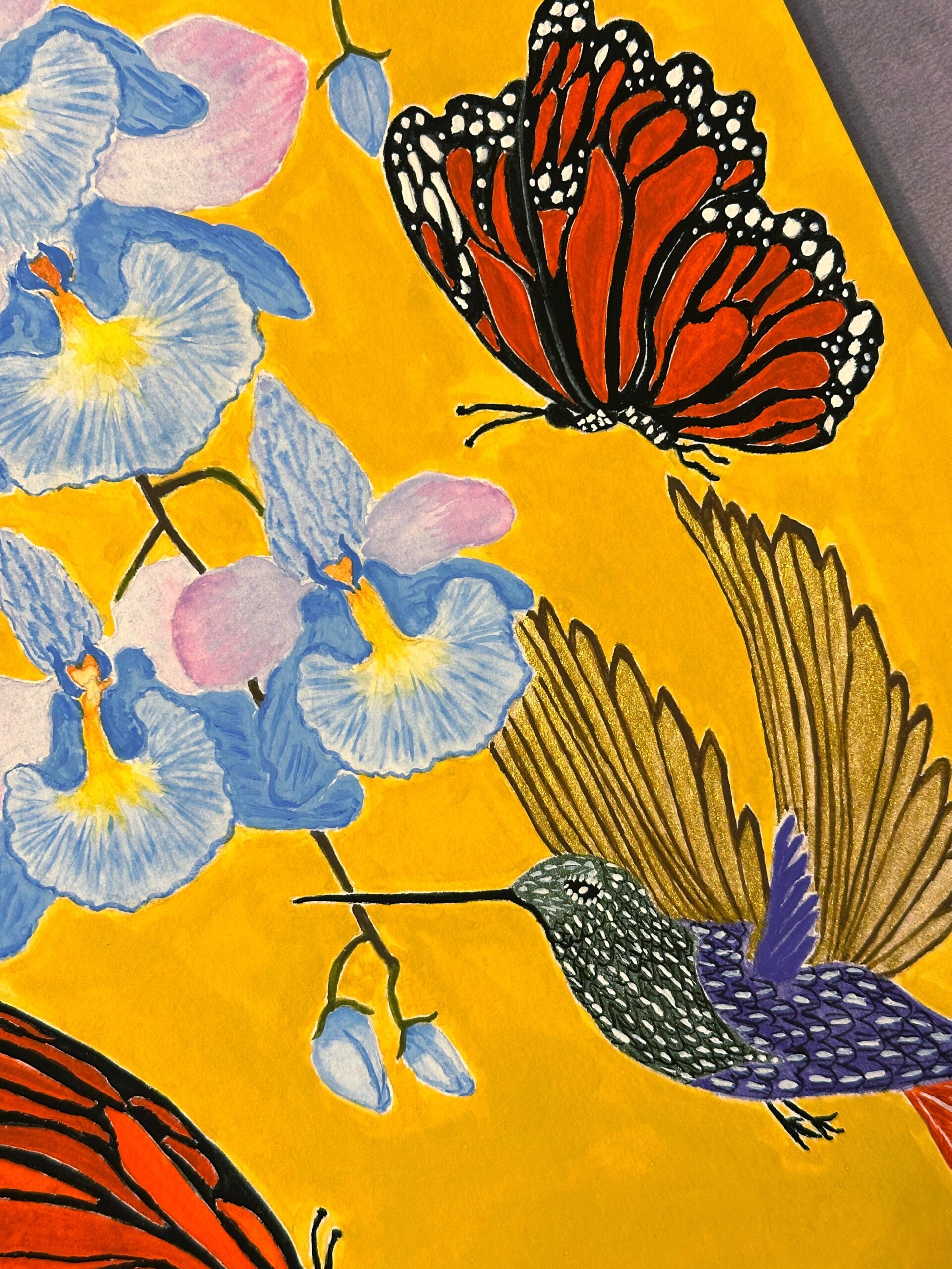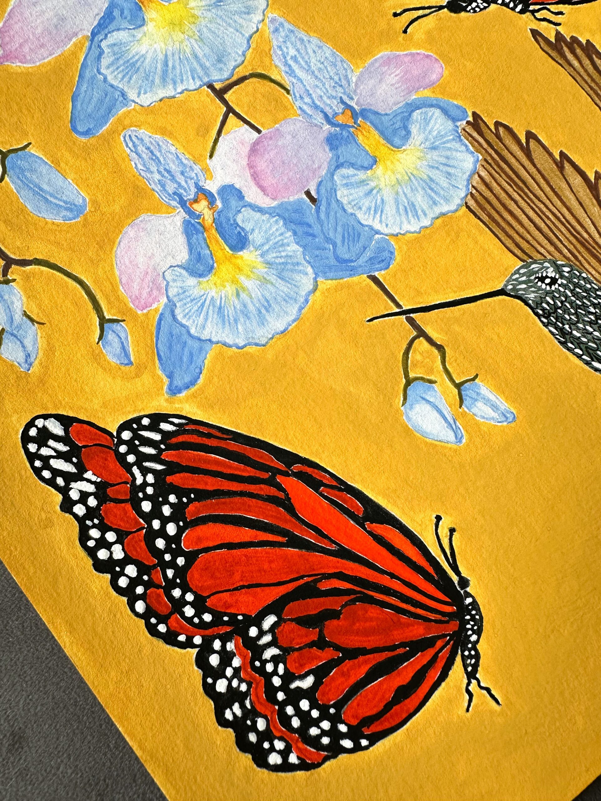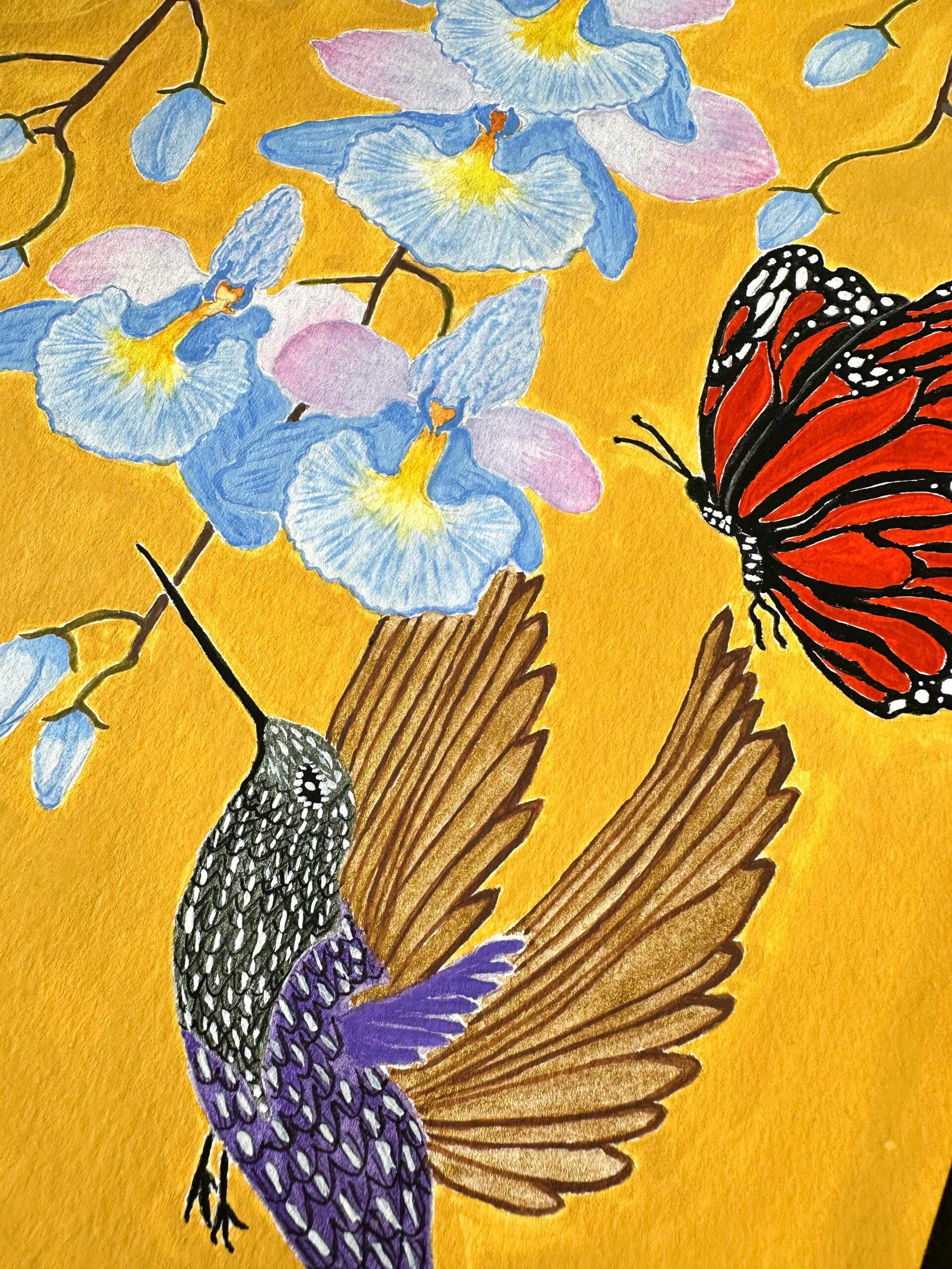 Humingbird, Monarch Butterflies and Pastel Blue Orchids