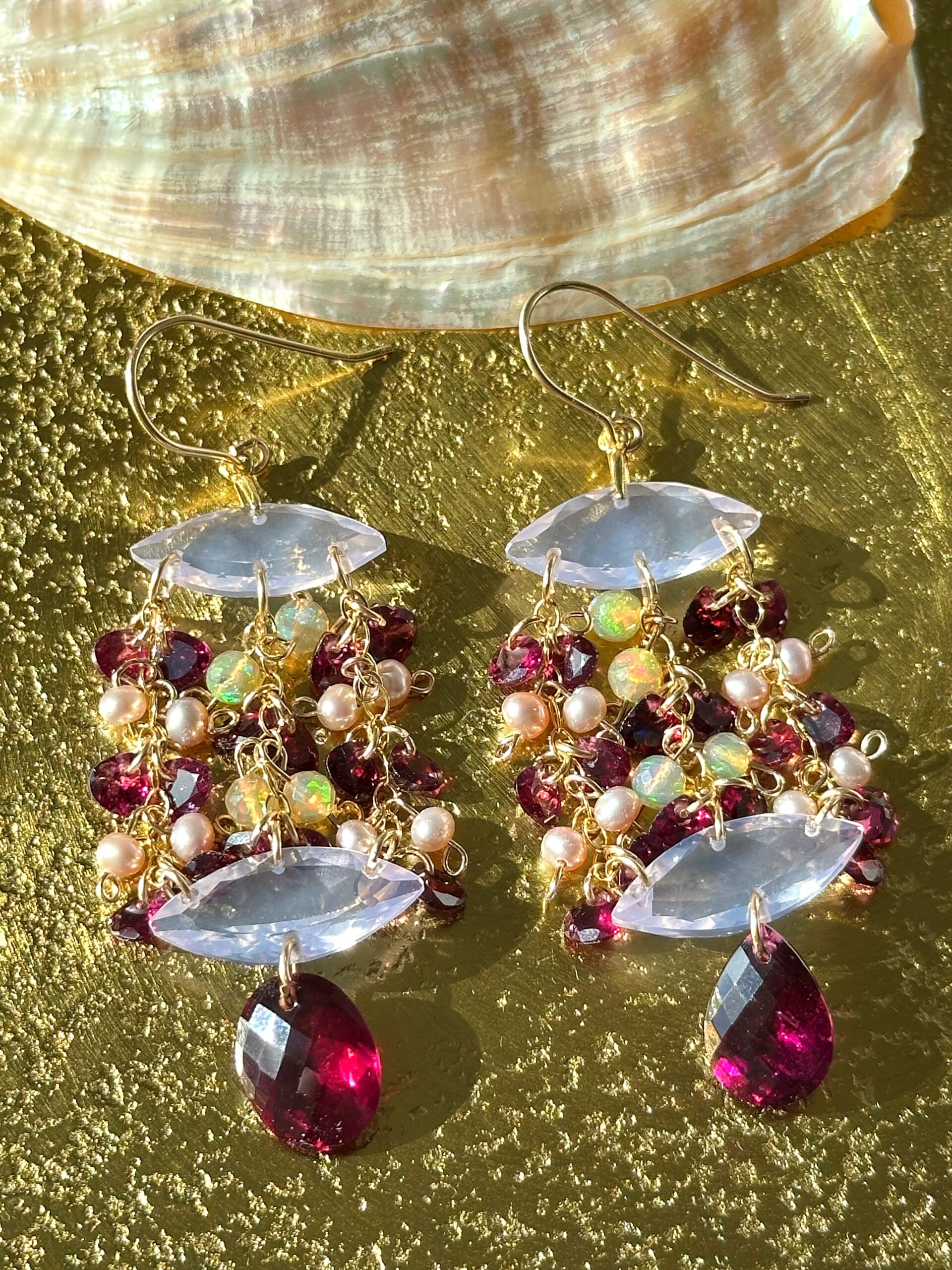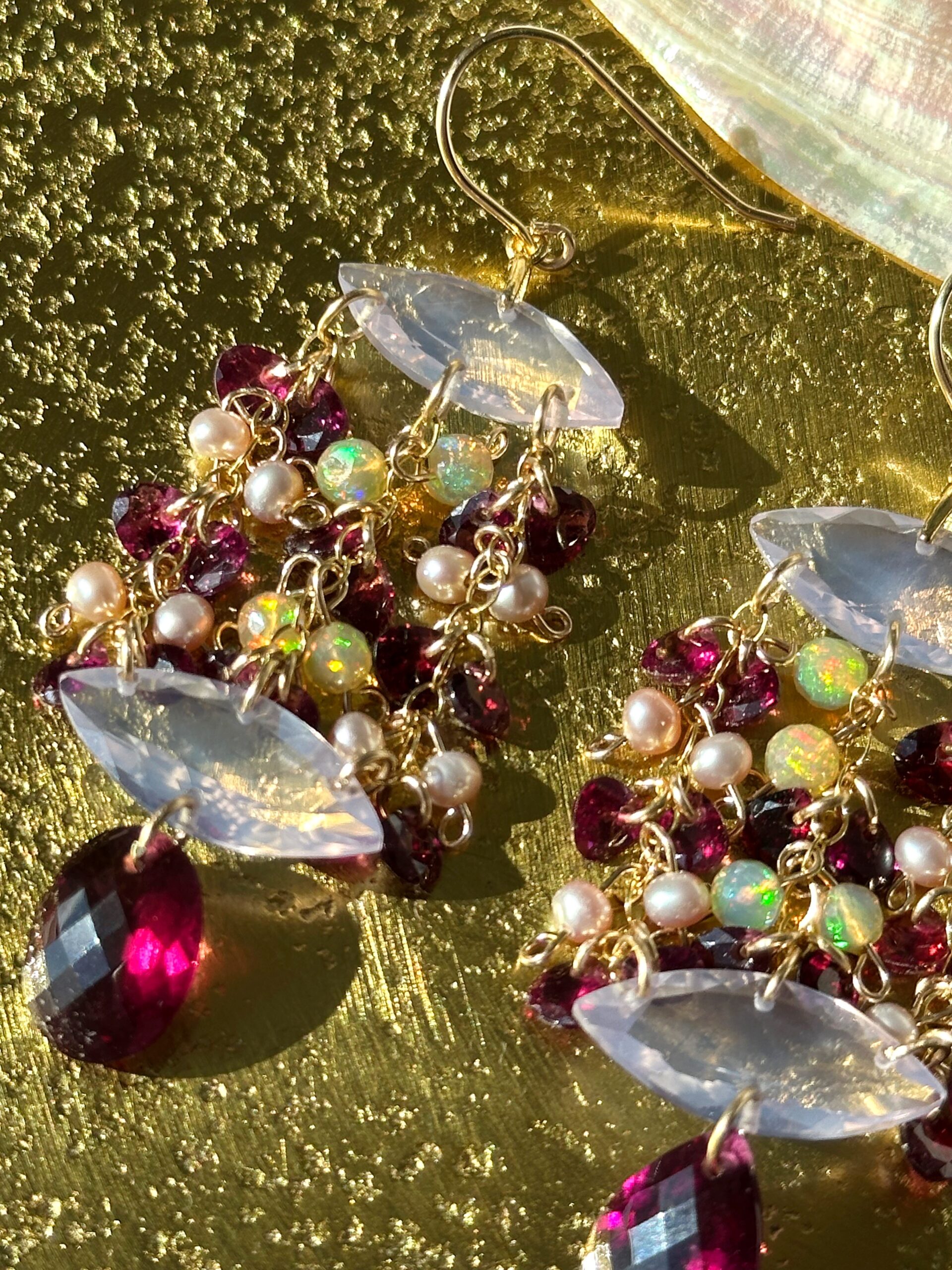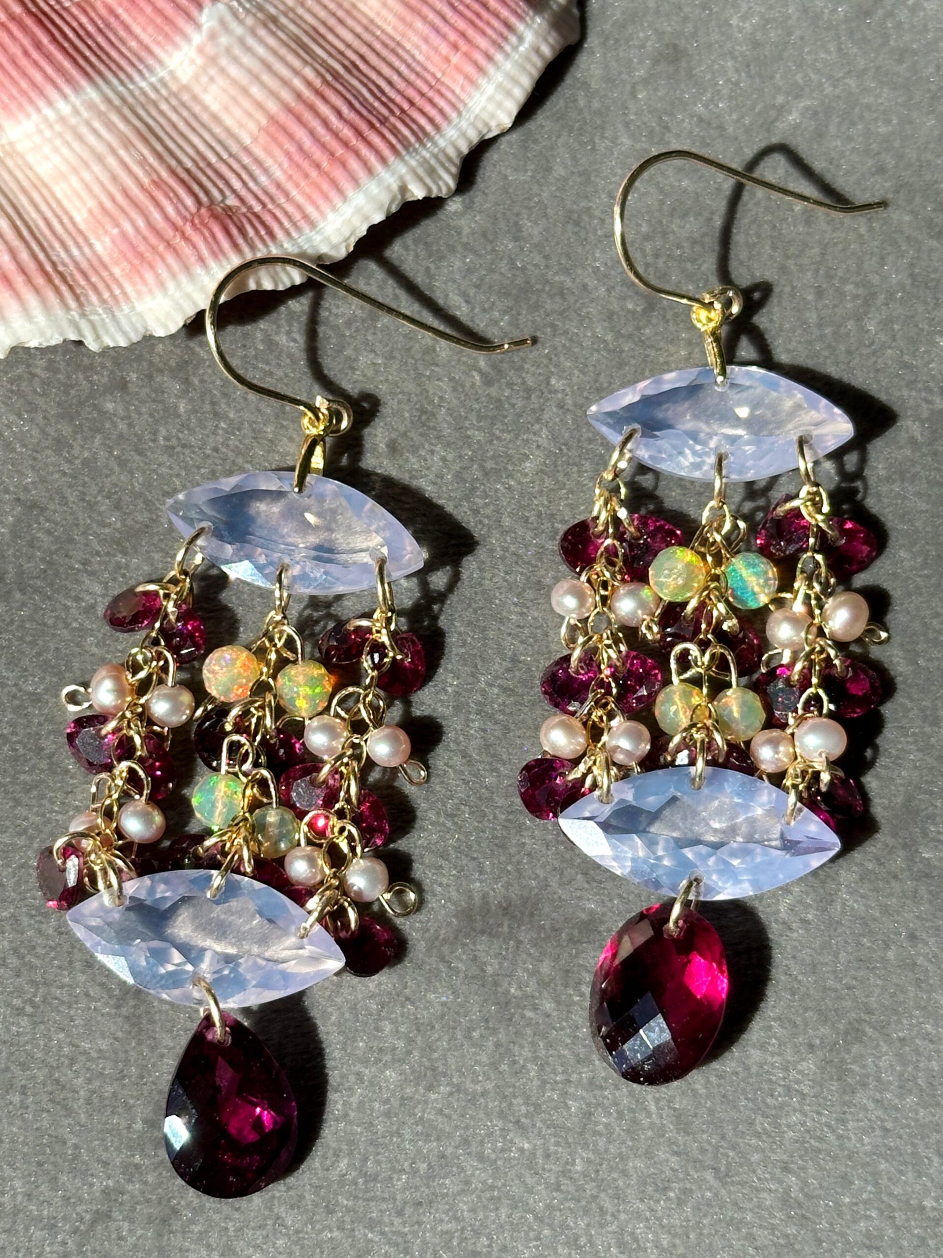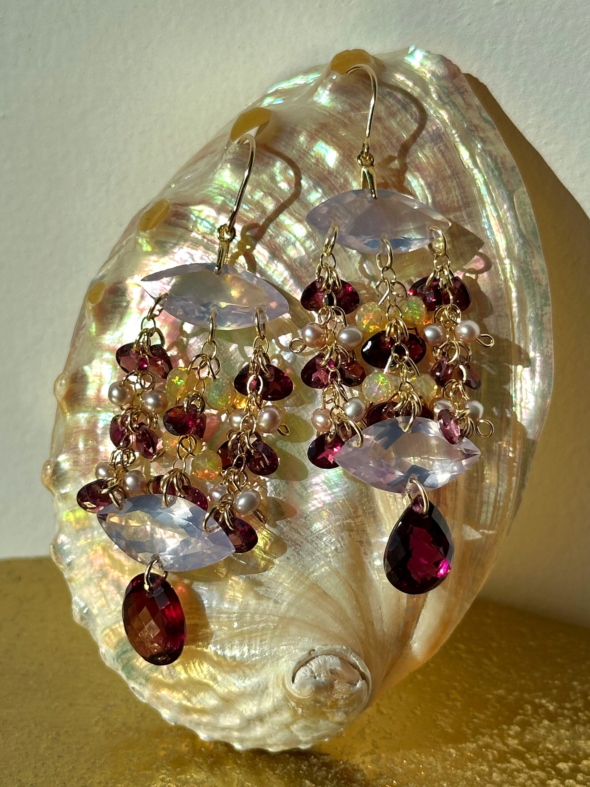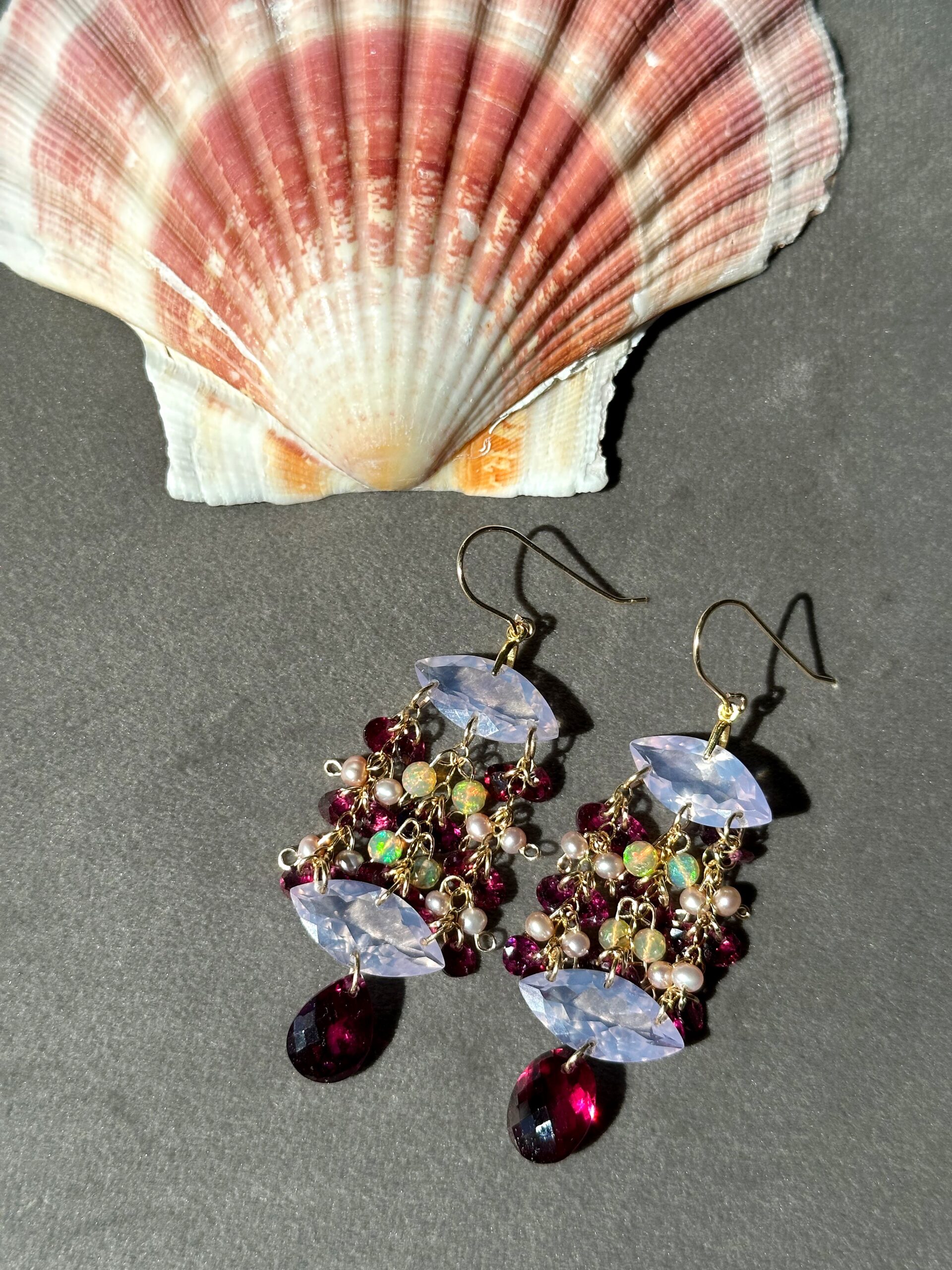 My ‘Celestial Cascades’ chandelier style featuring here marquise or else-called navette-cut lavender quartz, high-quality rhodolite garnet, Ethiopian opals and lavender seed pearls, all natural and untreated. A very regal, very enchanting pair of earrings, lavender quartz and rhodolite garnet make a gorgeous color pairing.