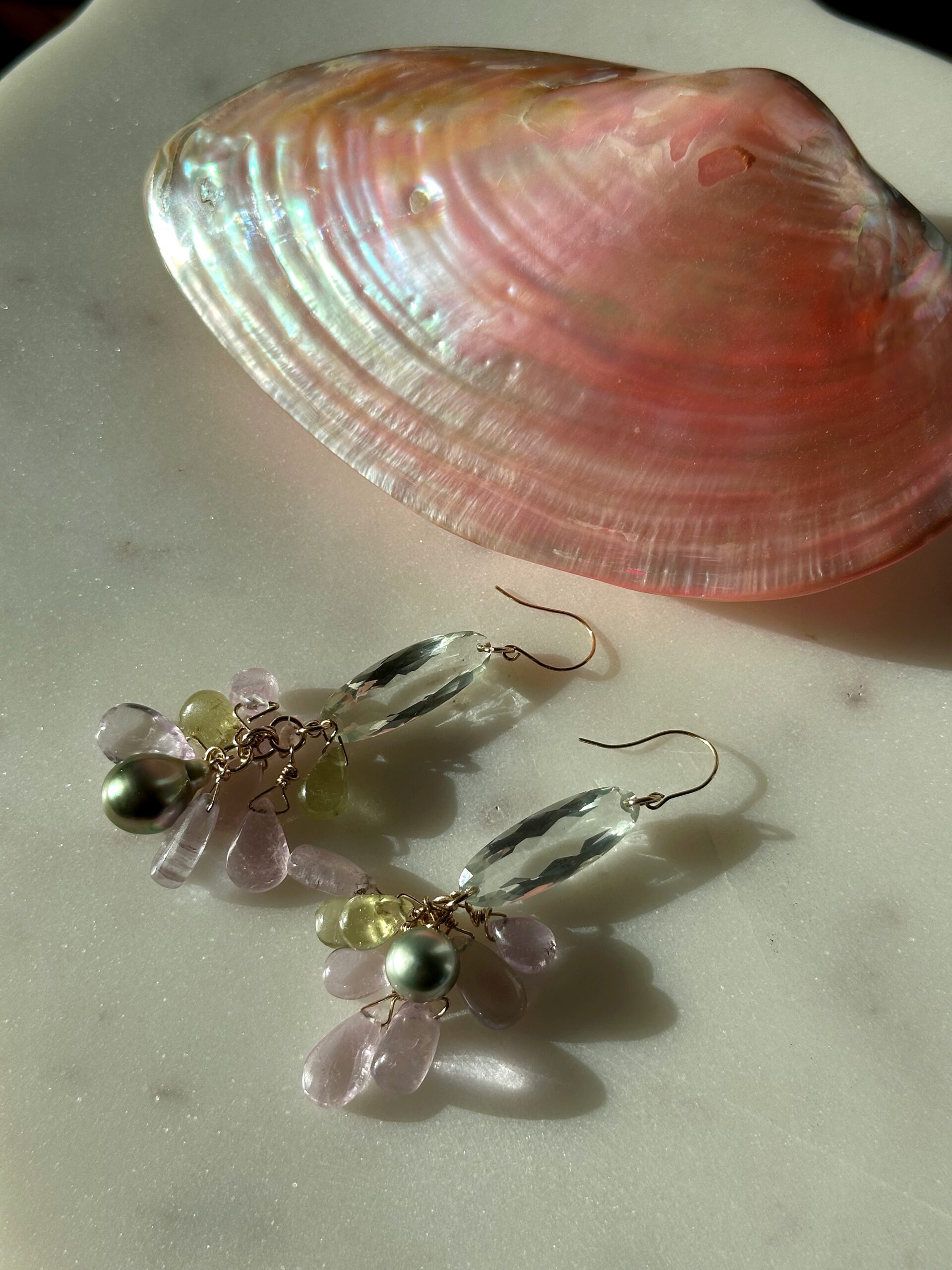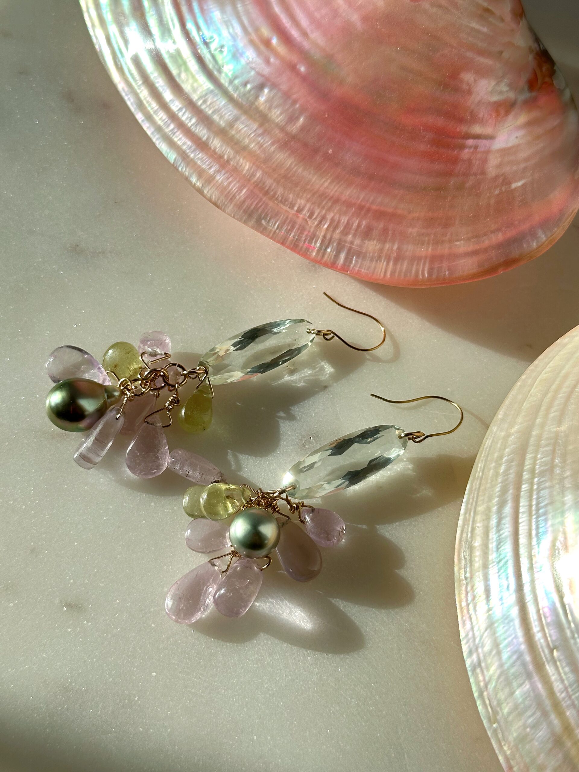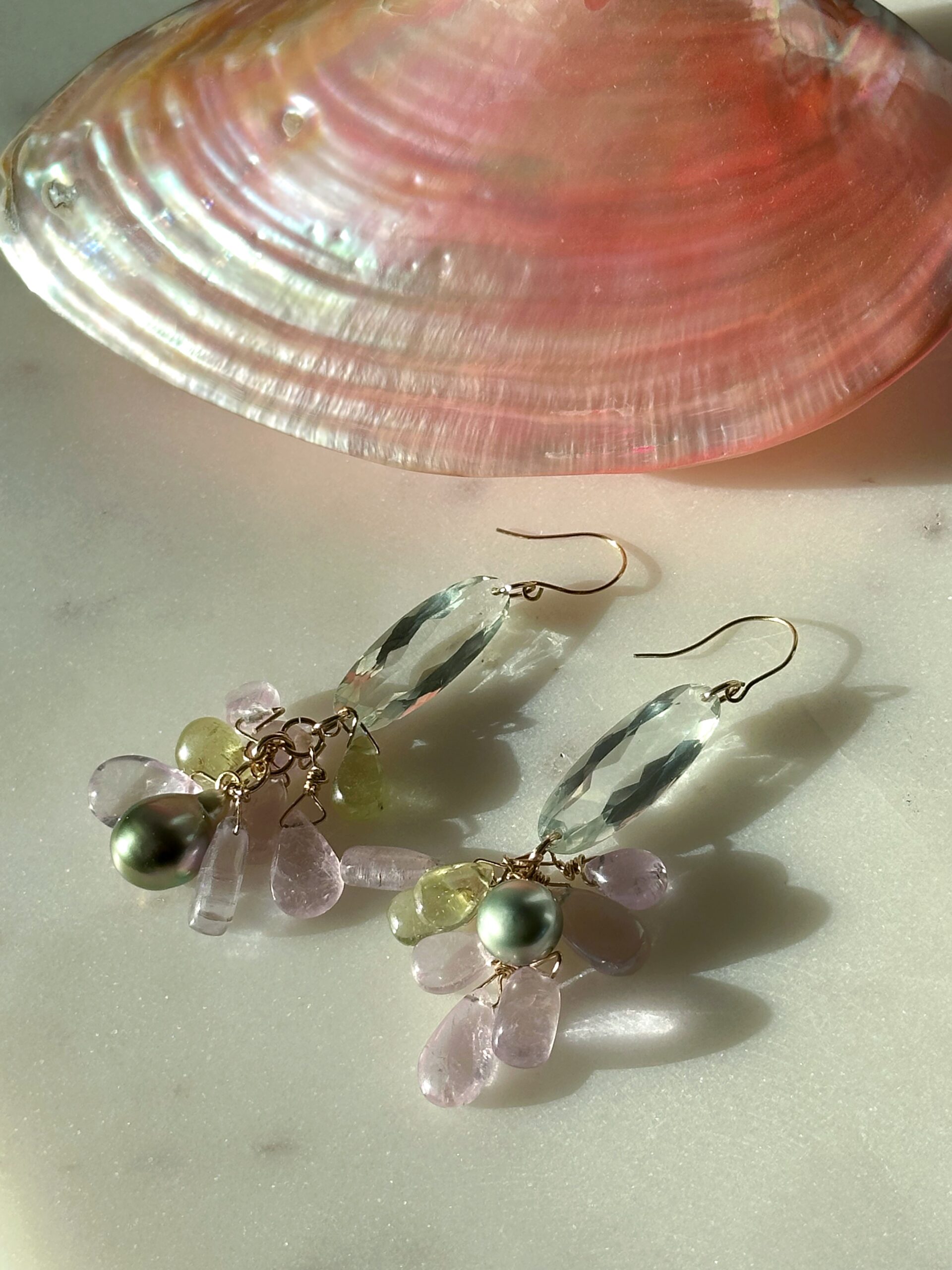 This new ethereal cluster pair of earrings features big faceted prasiolite ovals, kunzite and iridescent pistachioTahitian pearls, all natural and untreated. As always, the gems & pearls that I have used are of high-quality. The pearls in particular have a high luster and flawless blemish-free surface, just lovely. I have afectionately named the pair ‘Azalea’, like the delicate flowers which I love so much. Its pastel hues are really dreamy!