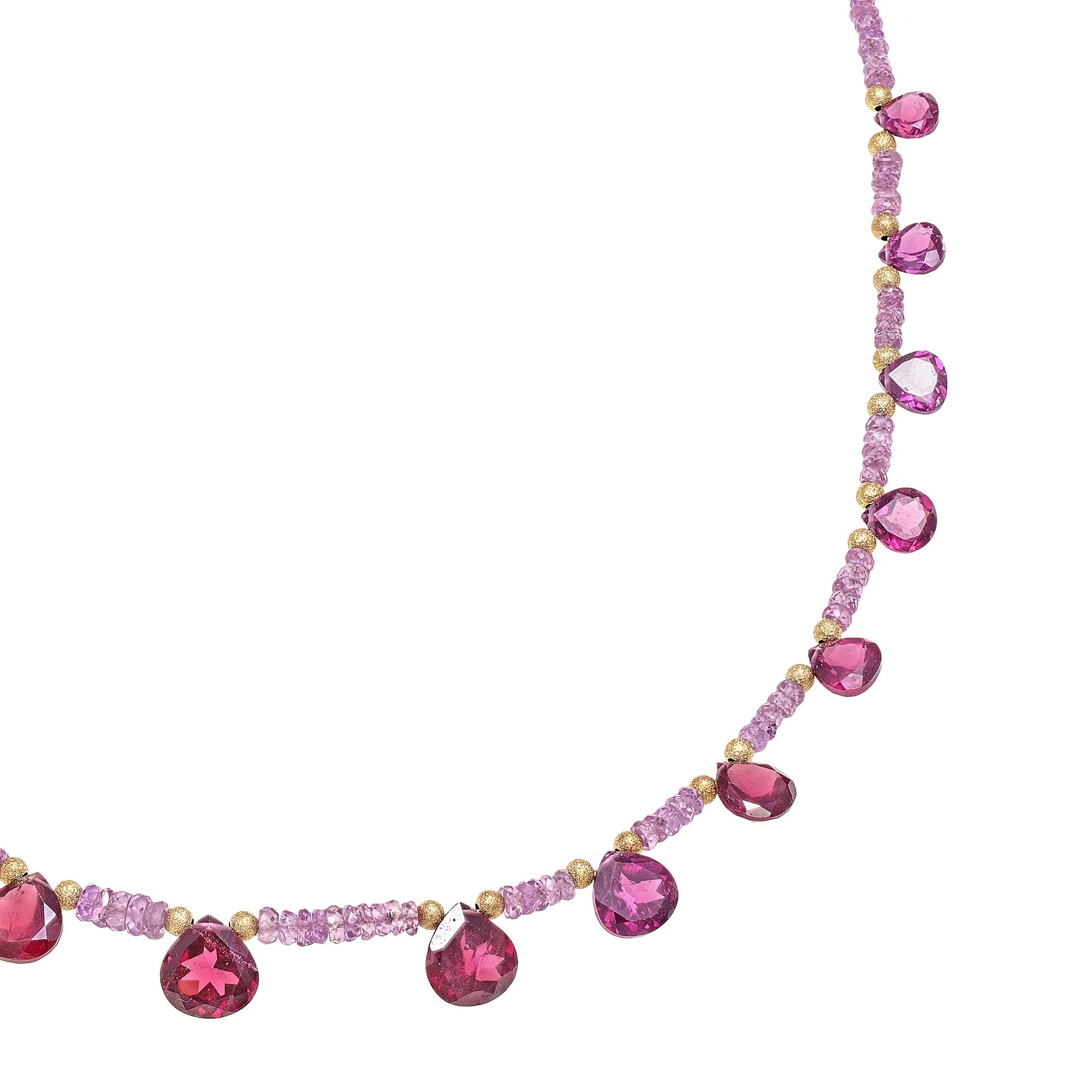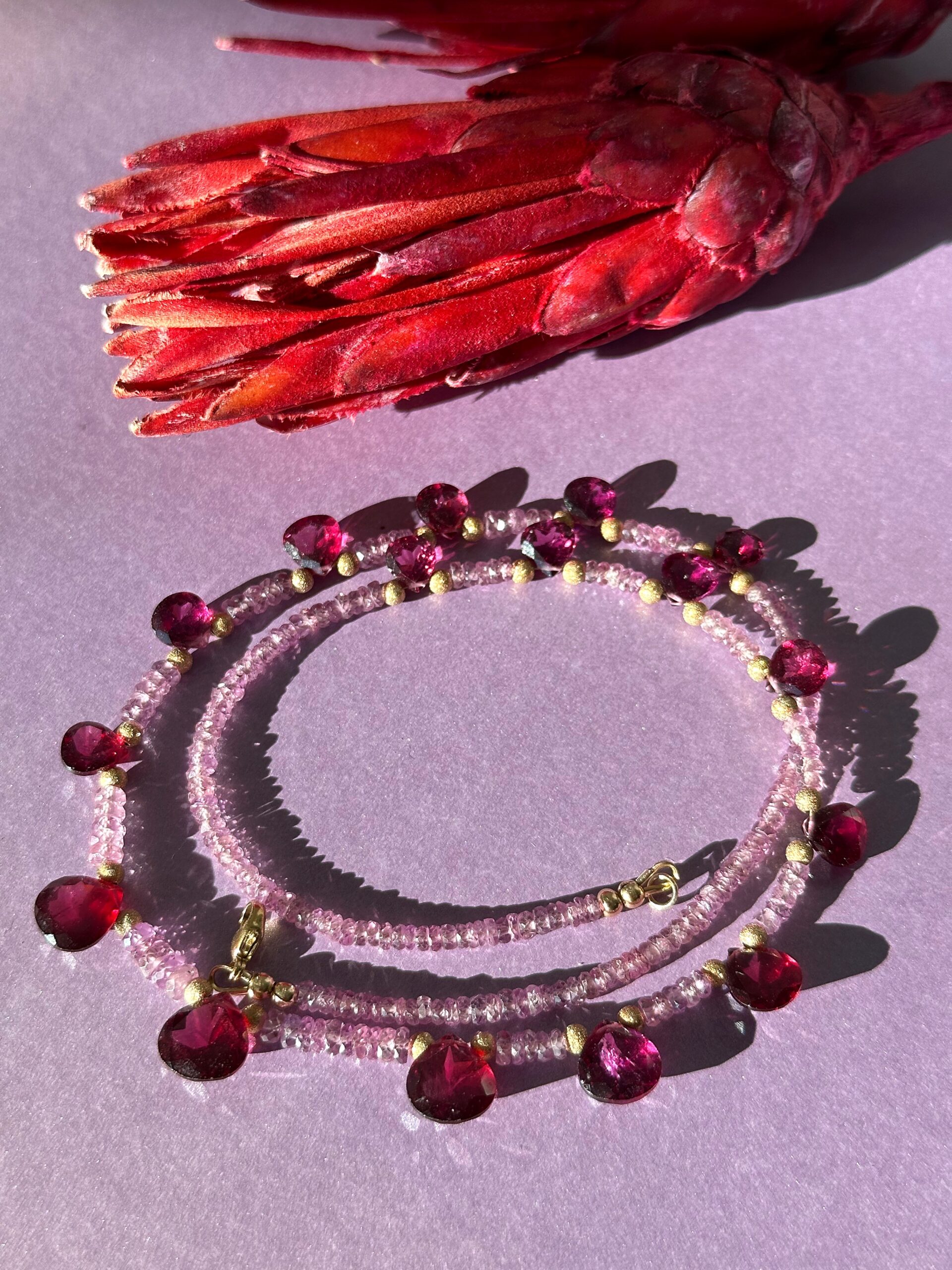 A beautiful necklace comprised of precious natural Madagascar sapphire and rhodolite garnet. It is a very sophisticated colour combination of purple/ deep lavender with reddish purple coloured gems. The pairing is really gorgeous, very regal. Hoping you will love it as much as I do!