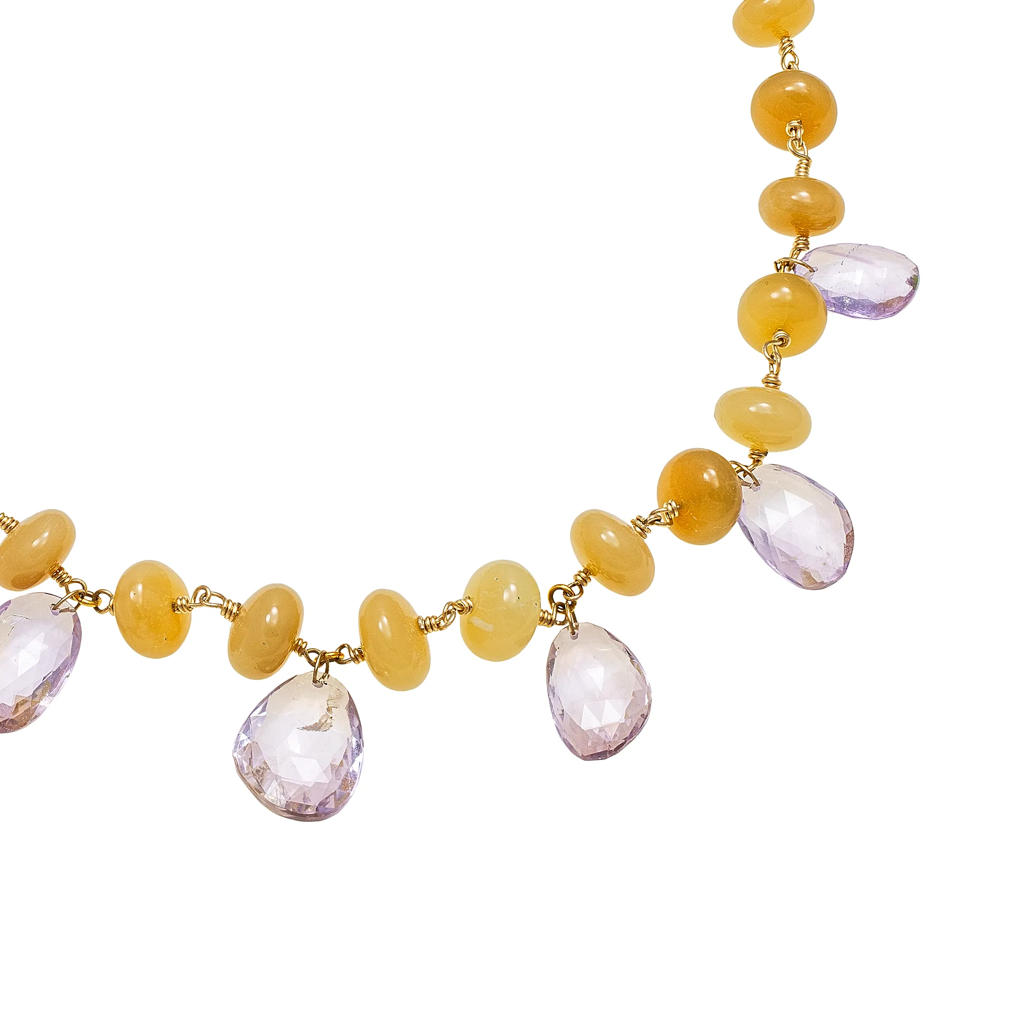 Gorgeous combination of yellow opal and pale lavender/ lilac Rose de France amethyst, this elegant necklace exhibits Chrysi Z.’s love for unusual gems combinations. It has been crafted by hand using the following hand-picked materials: